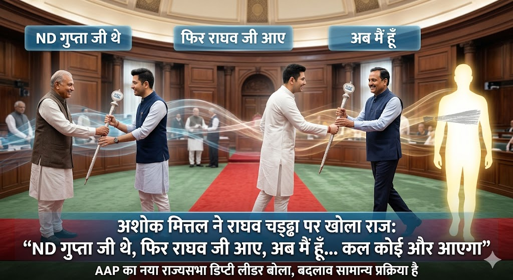 आम आदमी पार्टी (AAP) में राज्यसभा में हुए बड़े संगठनात्मक बदलाव पर नया डिप्टी लीडर अशोक कुमार मित्तल ने स्पष्ट और संतुलित बयान दिया है। उन्होंने राघव चड्ढा को डिप्टी लीडर पद से हटाए जाने को “पार्टी की सामान्य प्रक्रिया” बताया और कहा कि “ND गुप्ता जी डिप्टी लीडर थे, फिर राघव जी आए, आज मैं हूँ, कल कोई और आएगा।”