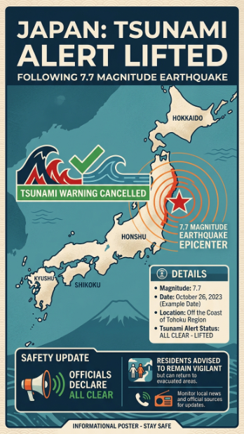 जापान में आज सुबह 7.7 तीव्रता का तेज भूकंप आया। भूकंप के बाद तुरंत सुनामी का अलर्ट जारी कर दिया गया था। लेकिन कुछ घंटों बाद जापान ने सुनामी का अलर्ट वापस ले लिया है। इस खबर से पूरे देश में राहत की लहर दौड़ गई है।